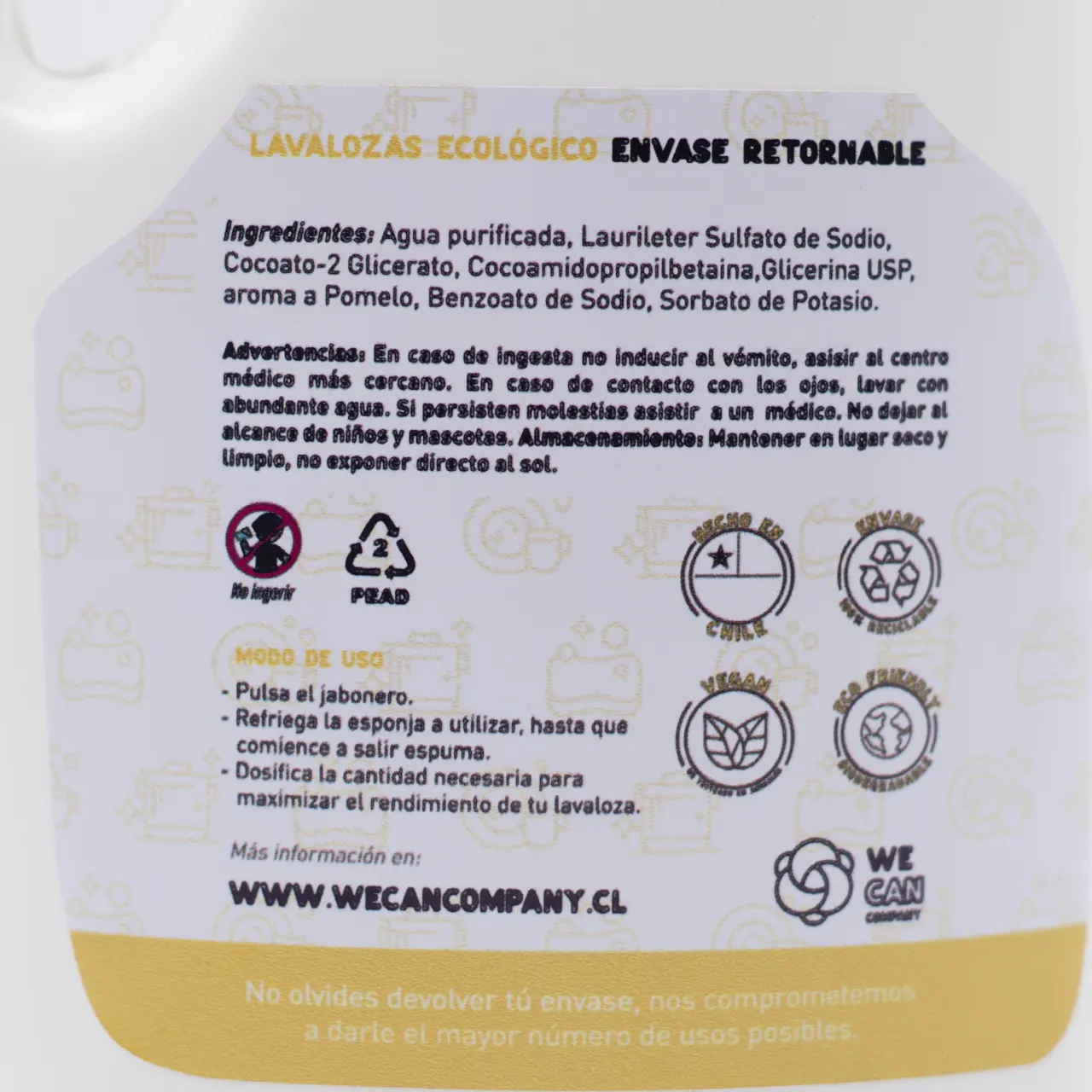 Lavaloza Ecológico en Lata Can Clean Concentrado, se puede Diluir hasta 20 veces para hacer lavaza . Formulado en base a materias primas de Origen Vegetal, Biodegradables y Sin Testeo en Animales. Producto certificado Hipoalergénico que garantiza limpieza de calidad mientras cuidas tu piel y el medio ambiente. Fabricado con una agradable Fragancia de Pomelo, para dejar un exquisito aroma mientras lavas.